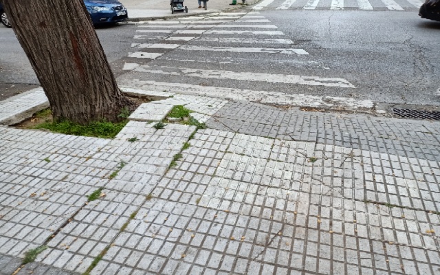 baldosas rotas y levantadas por culpa de las raíces de un árbol junto a una de las entradas del Parque Castelar. zona muy transitada por personas mayores y carritos de bebé (personas con movilidad reducida). el mal estado de las aceras dificulta acceder al paso de peatones.