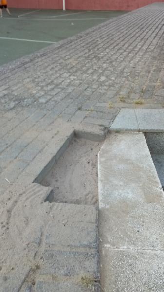 En la pista deportiva del parque de San Fernando. Adoquines desaparecidos. Urge reparación o acabarán quitándolos todos.