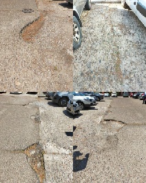 Aparcamiento en Avenida de Perú n°24 con asfaltado muy destrozado. Ruedas de coches rotas y varias personas accidentadas.