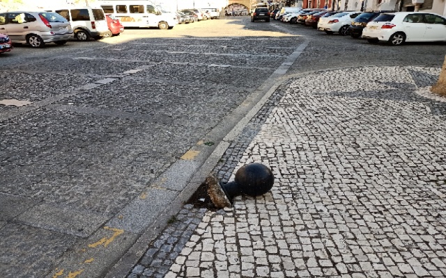 bolardo arrancado y tirado en la acera junto al bordillo en la Plaza San José