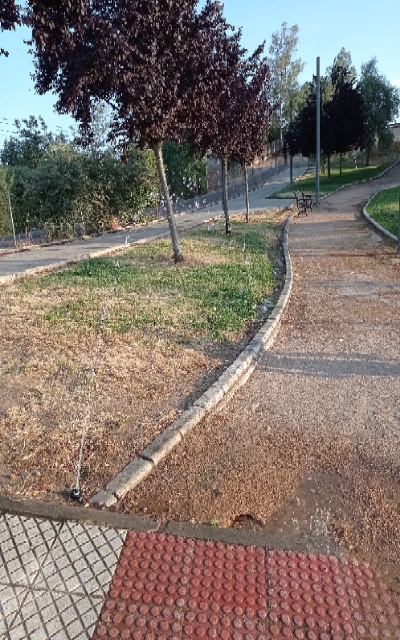 El aspersor está en mal estado y está haciendo un surco en el suelo, justo donde termina el acceso peatonal, y como el camino no se arreglará habrá que poner otra incidencia.... Barrio abandonado.