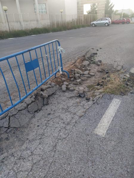 Asfalto levantado junto Maderesa, más de dos años. Pusieron dos vallas, pasan los coches por el medio. Ya pronto no pueden ni pasar. Comunicada incidencia al Ayuntamiento y ni caso