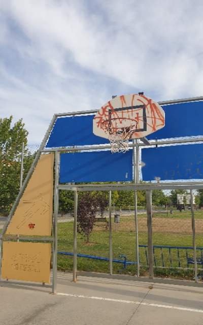 La que sale en la foto, no, la otra, que está pegada a los arboles tiene el tablero roto y esta torcida.
