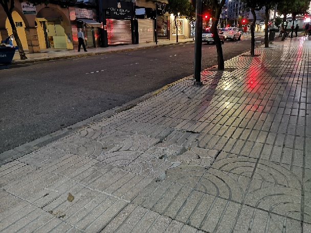 En la acera se encuentra una zona considerable que se ha hundido y pisando sobre ella se tiene la sensación de colchón, además las baldosas están rotas y descolocada que amenazan que cualquier persona despistada pueda caerse, con el consiguiente peligro de lesionarse para las personas andantes