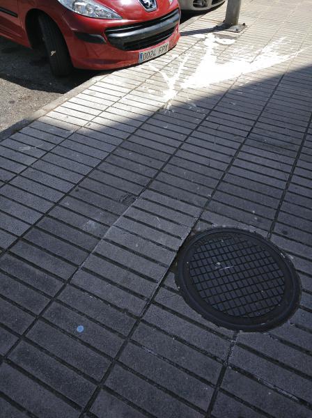Hay un par de baldosas levantadas al lado de la tapa metálica. Ha habido varias caídas de personas en ese punto. Por favor. Arreglar antes de que haya alguna caída más