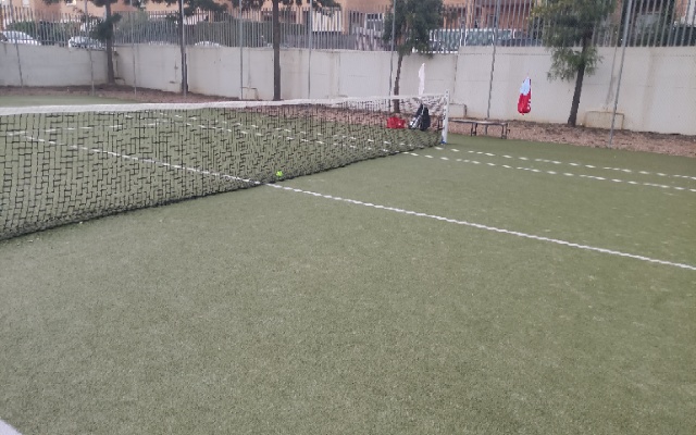 La alambrada del fondo de las pistas de tenis se encuentra doblado y al existir hueco con el suelo las pelotas se salen fuera de la pista, se podría poner una chapa para evitarlo.
