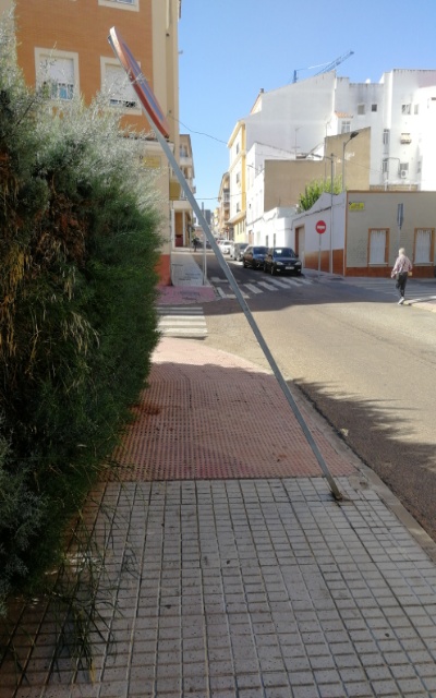 Algún vándalo ha doblado la señal e invade el acerado. Viven invidentes en la zona, y está claro que no podrán esquivar el golpe. Está claro que los vándalos hh.pp. sólo piensan en ellos