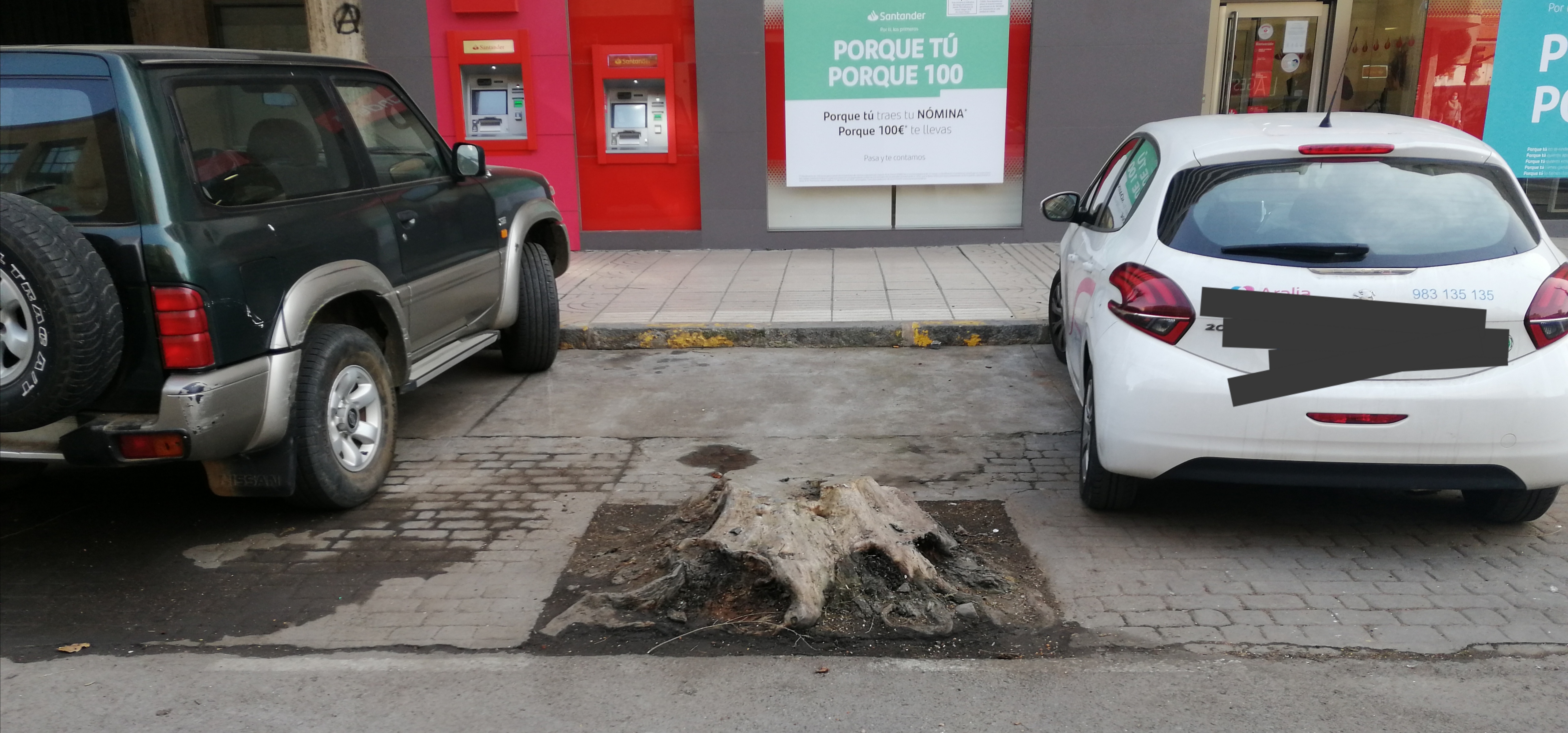 En la ronda del Pilar, justo donde está la oficina del banco Santander, se encuentra el tronco de un árbol talado ocupando una plaza de aparcamiento. Este no está visible y varios vehículos e incluido yo me he topado con él al querer hacer una parada correctamente. Por favor, visibilizarlo o retiren lo de la calzada.