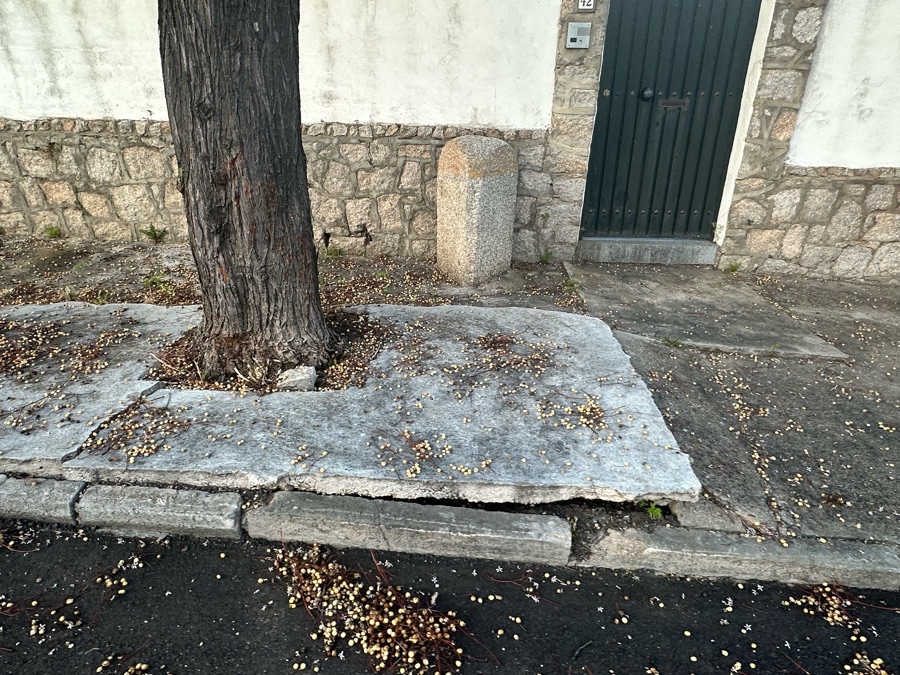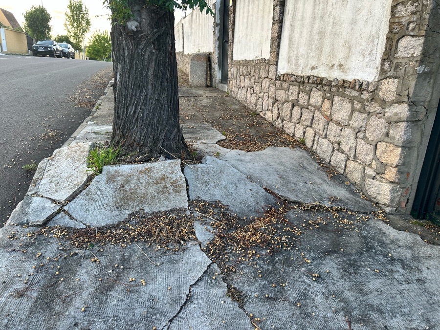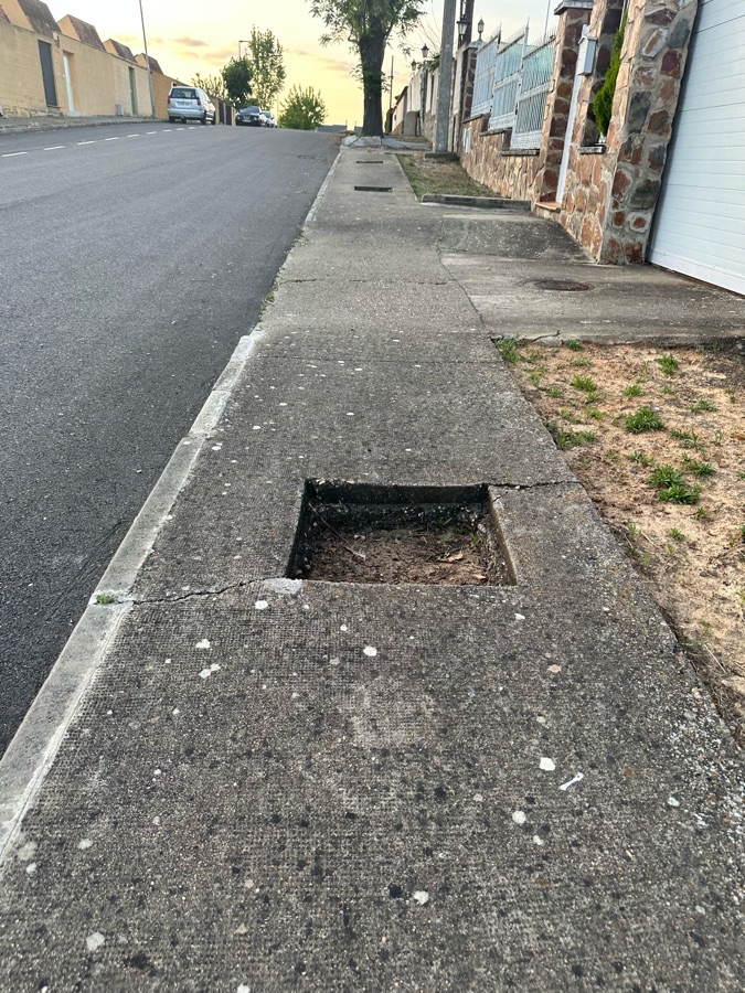 La acera se encuentra en muy mal estado debido a la vegetación existente. En otros puntos impide el paso el hueco que alojaba el arbolado.