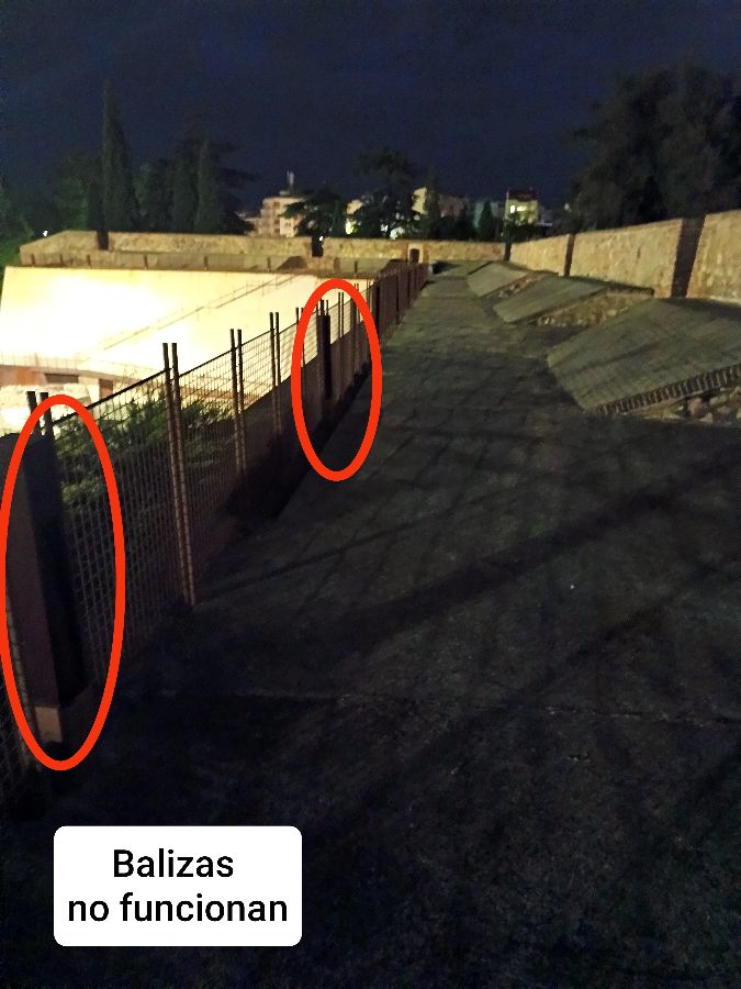 La iluminación del Baluarte de La Trinidad no está operativa. Las luces empotradas de las escaleras no funcionan, y las balizas metálicas de las vallas de la parte superior tampoco. En la mayoría de las balizas se ve que han robado las bombillas, y otras simplemente las han roto. Sería interesante poner algún sistema que impida esos actos vandálicos (quizás la colocación de una reja o jaula en los focos, como en otros puntos de la ciudad). Espero que puedan poner solución al problema, muchas gracias por su trabajo.