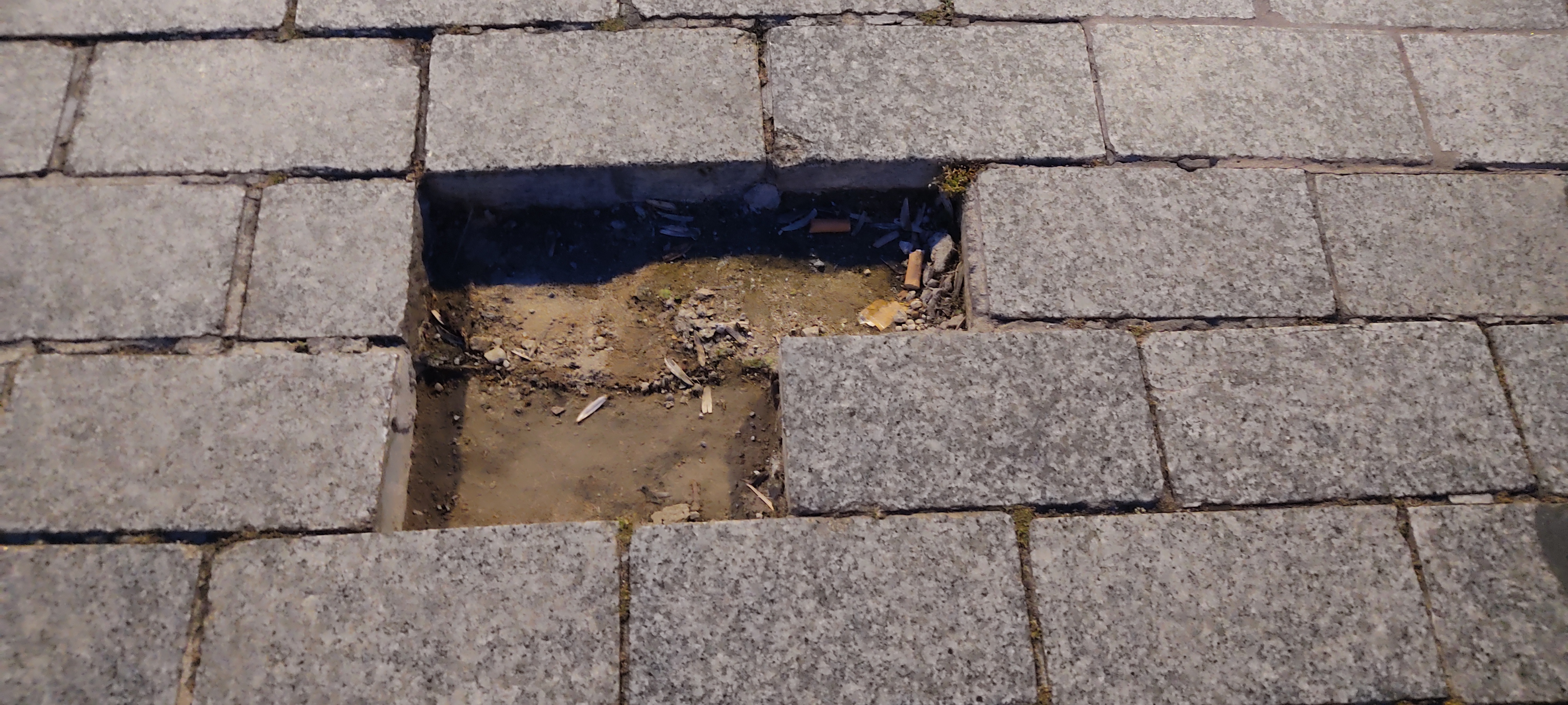 Faltan adoquines en el puente de Palmas. Un peligro para las cientos de personas que pasamos diariamente por allí. Está a 30 metros de los castilletes en la zona central.