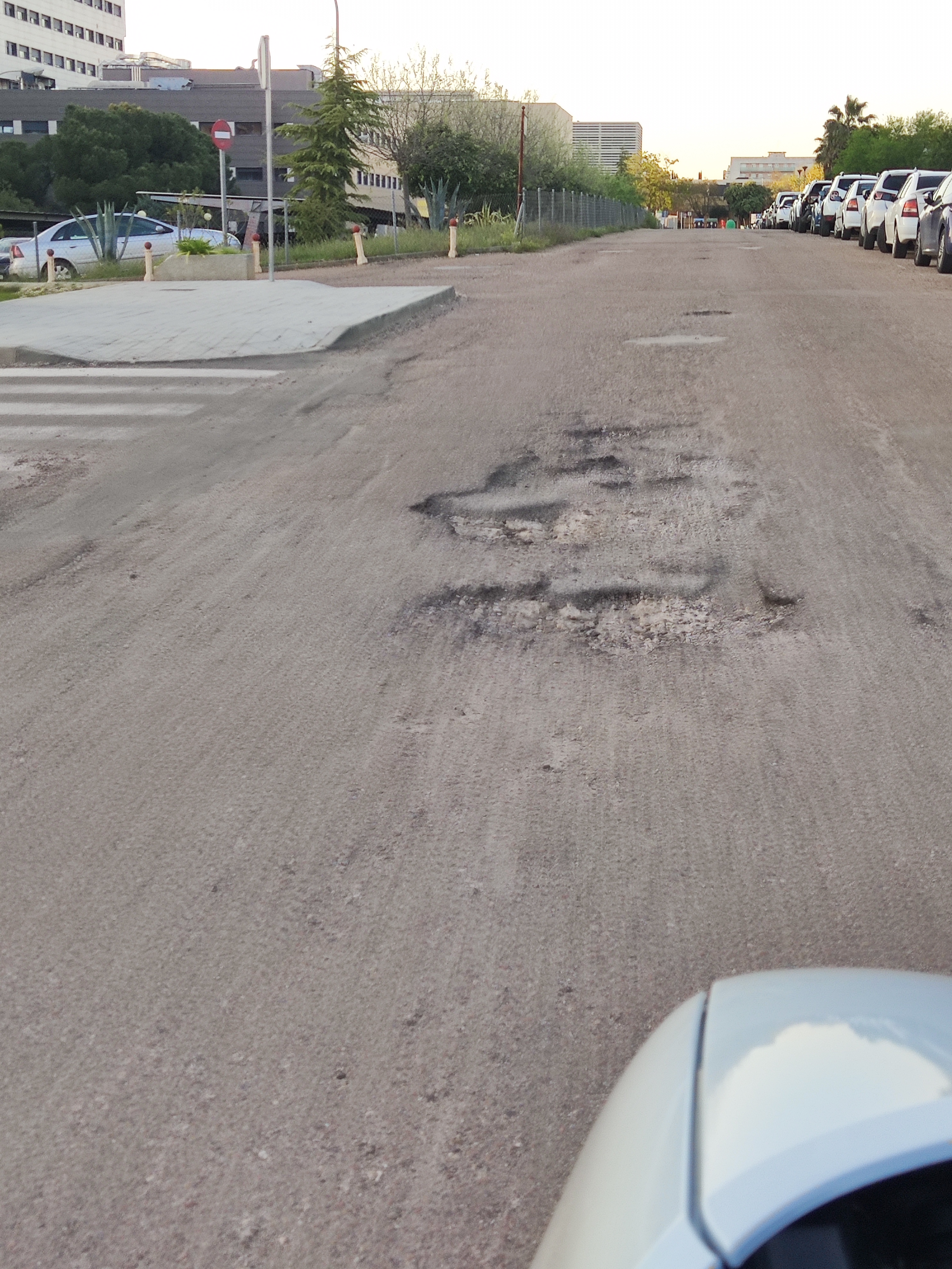 Socavones abiertos a lo largo de toda la vía que rodea el Hospital Universitario Badajoz. En algunos casos para sortearlos hay que invadir el carril contrario y va a haber algún accidente. Además del malestar que provoca en los usuarios y trabajadores del centro sanitario.