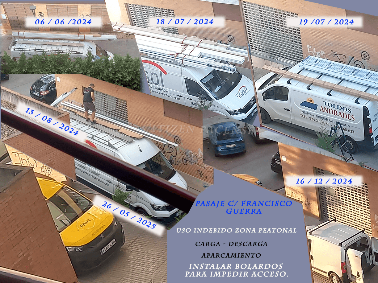 Empresas utilizan pasaje peatonal como zona carga / descarga y aparcamiento. Se SOLICITA, instalación de bolardos para impedir acceso de vehículos comerciales.