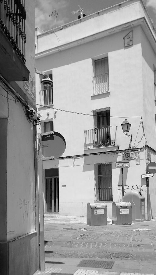 La cámara de vídeo vigilancia está situada sobre la confluencia de tres calles, no obstante, debe servir para bien poco: basura en las aceras a cualquiera, propietarios de perros que los dejan sueltos para que salgan a cagar, vehículos estacionados en la acera impidiendo el transito, trapicheo en varios puntos de venta, vecinos que sacan sin pudor alguno el mobiliario viejo y lo dejan en las aceras...