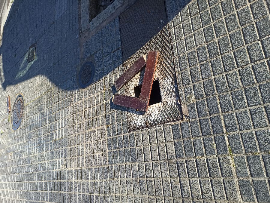 Agujero en tapa metálica en la acera. Imposibilita el paso a los peatones, riesgo de caída y lesión. Ya se ha avisado de la incidencia en varias ocasiones. El último aviso fue en marzo de 2025.