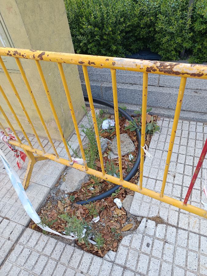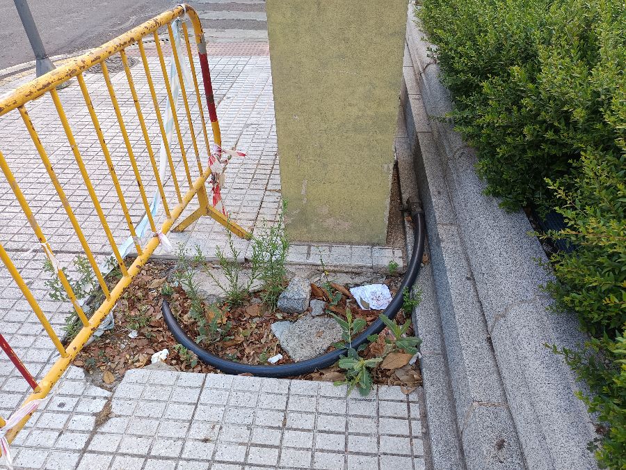 Desde hace meses hay una pequeña zanja con un tubo de polietileno sobresaliendo de ella. La zanja tiene vegetación y suciedad, y junto con la valla, la imagen que da es muy mala (teniendo en cuenta que está delante de un monumento). Solicito que se termine la obra y se restablezca la situación normal de este emplazamiento, muchas gracias de antemano.