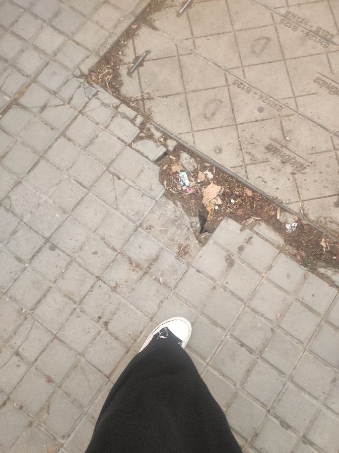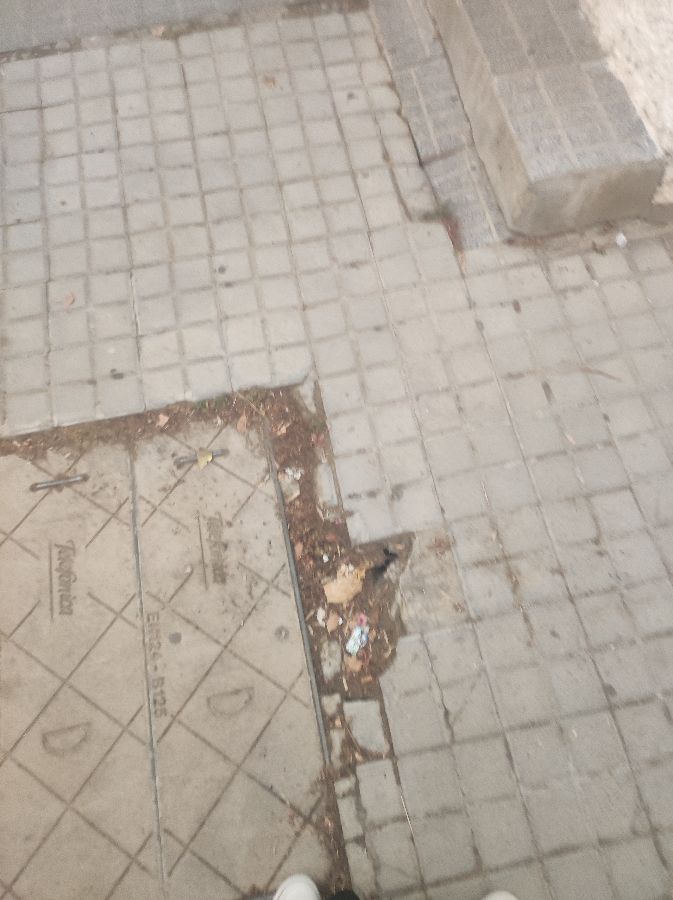 El acerado de la calle a la altura del número 6, está hundido y con grieta. Cerca hay una arqueta de teléfonica también hundida. Es una zona de mucho paso, sobretodo los martes por el mercadillo y alguien puede sufrir un percance fuerte.