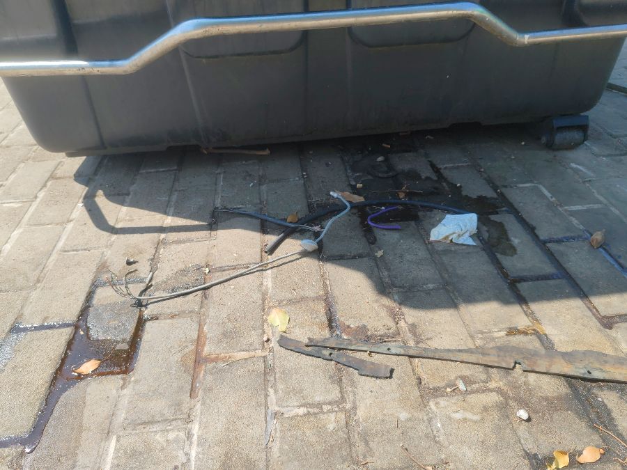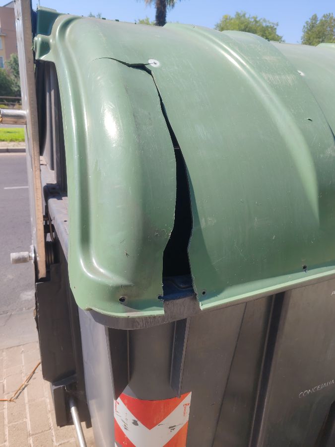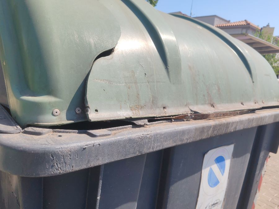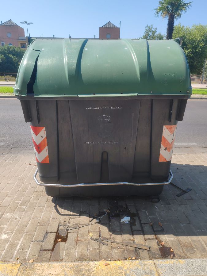 Contenedor roto por varios sitios, vierte por debajo, con un hedor insoportable, todo el día lleno hasta arriba por los restaurantes de la zona, nadie viene a limpiarlo y el hedor llega hasta dentro de las casas, haciendo delante un jardín en el que no puede estar debido al hedor en verano.
