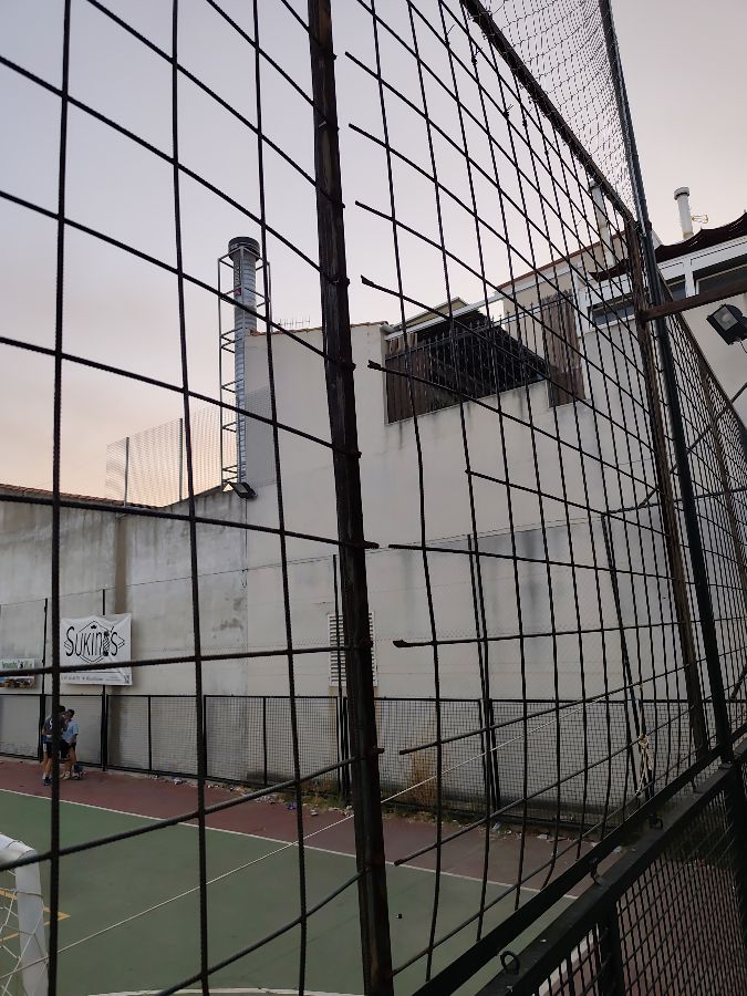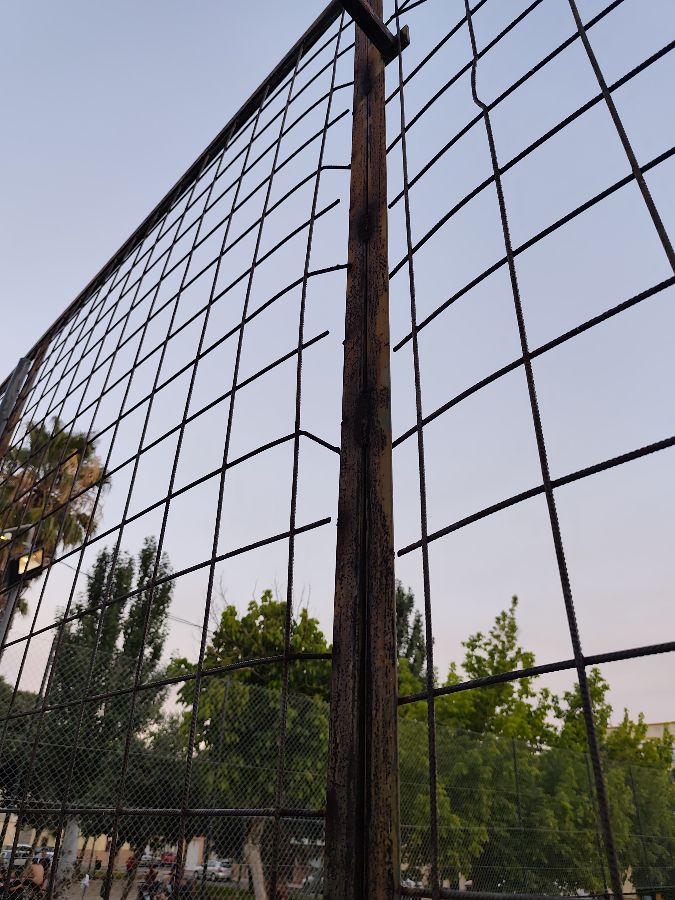 Las vallas de la pista de fútbol deportiva presenta deficiencias en la zona de entrada de la aavv. Están las puntas de los hierros al aire y hay veces que el balón se queda encajado al golpearlas, se suben los niños para desencajarlos con el peligro que supone