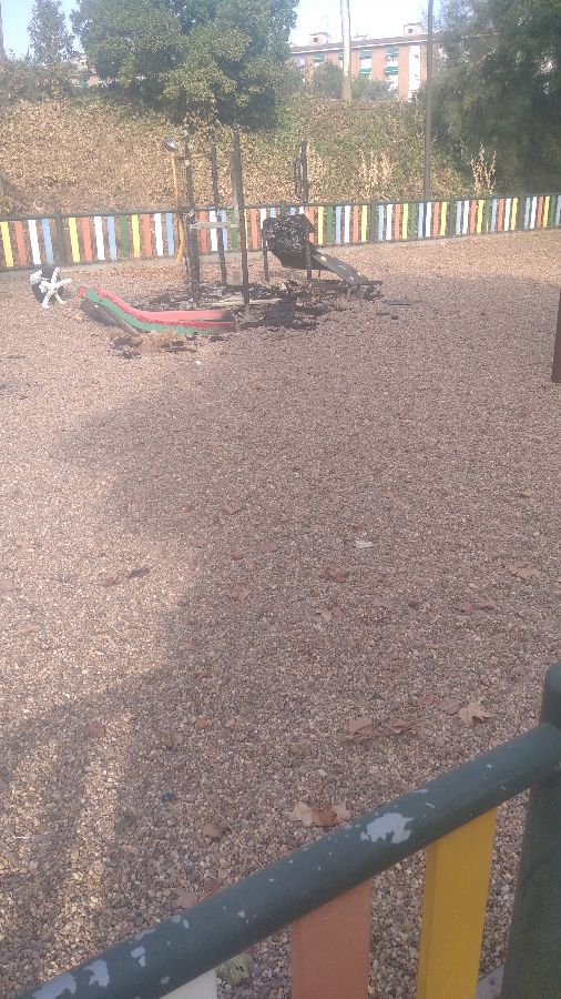 Los aparatos de juego de la zona infantil situada en uno de los laterales del puente de madera del parque del rio Revellin estan quemados hace mucho tiempo. Además de no reponerlo, estan los restos, con peligro para los niños. Hay que reponerlo.