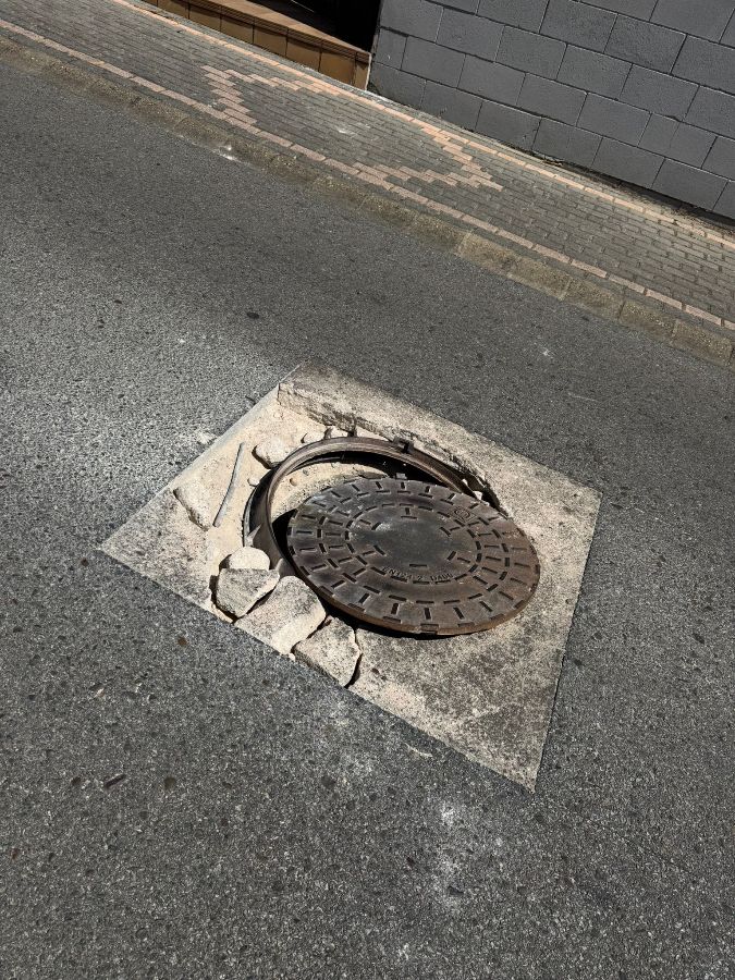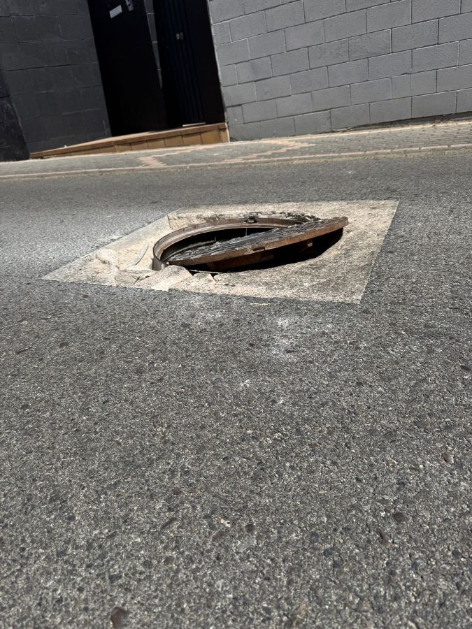 Arqueta a punto de desprenderse y ocasionar accidentes y daños en vehículos