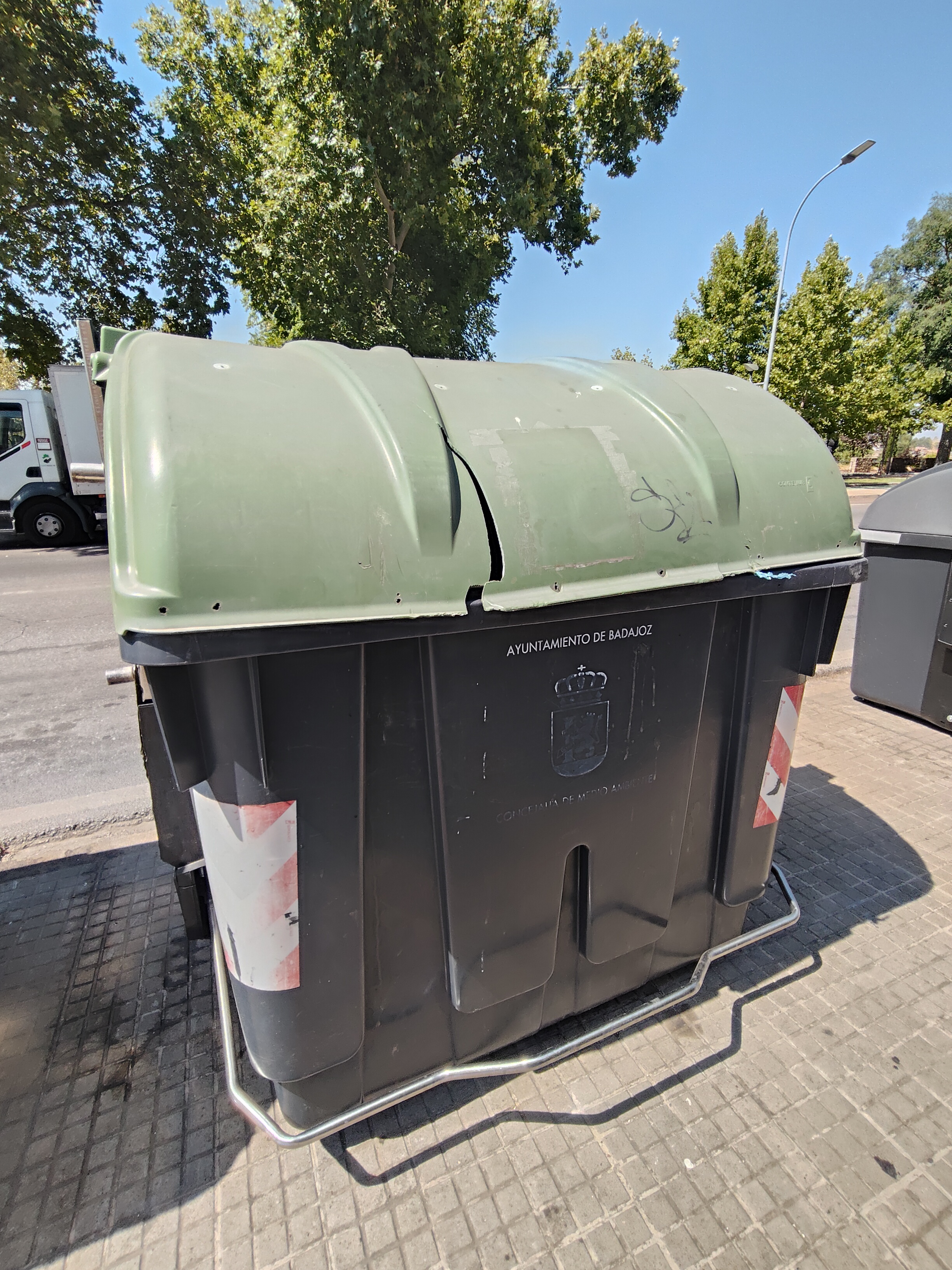 La tapa del contenedor verde está rajada e impide su apertura correcta con el pedal. Hay que abrirlo con la mano, imposibilitando esto el tirar la basura a las personas mayores ( que son muchas) que viven cerca.