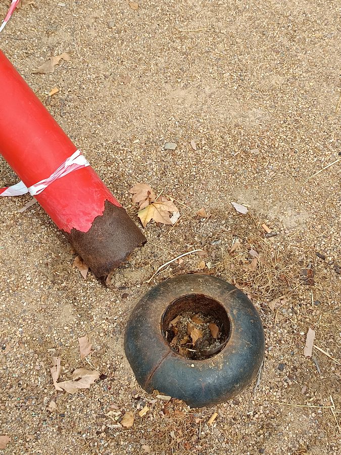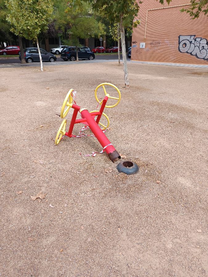 Uno de los aparatos de gimnasia del parque lleva tirado en el suelo varias semanas. Está roto en su base por la corrosión, y tiene filos cortantes. Debido a su ubicación en un parque infantil, sería conveniente su arreglo. También está roto el aparato de pedaleo, situado más arriba en el parque.