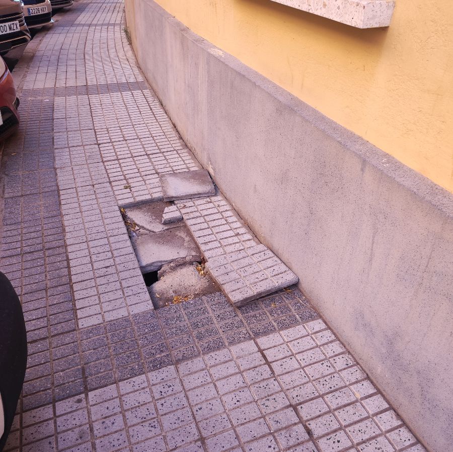 La acera llevaba tiempo con baldosas sueltas que se movían al pasar, ahora faltan baldosas y tiene agujeros profundos con claras señales de hundimiento del acerado.Se puede apreciar en las fotos. Lleva más de un mes así y ahora se están hundiendo también baldosas al otro lado del portal número 3 de la calle. También se adjunta foto.
