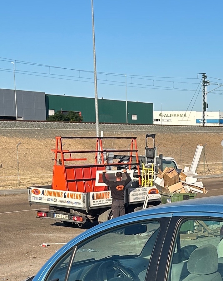 Las empresas se acostumbran a dejar allí basura que podían llevarlo al punto limpio. En este caso Aluminios Gamero se ha dedicado a dejar ventanas de aluminio fuera del contenedor. Siendo un peligro para la vía pública. El contenedor es el que está situado al final de la calle NEVERO Quince.