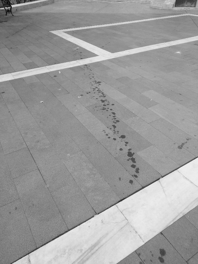 La máquina de limpieza, que la semana pasada regó con aceite toda la calle San Juan, ahora ha dejado un reguero de aceite en toda la plaza de San Francisco. Manchas absorbidas por la piedra que difícilmente desaparecerán.