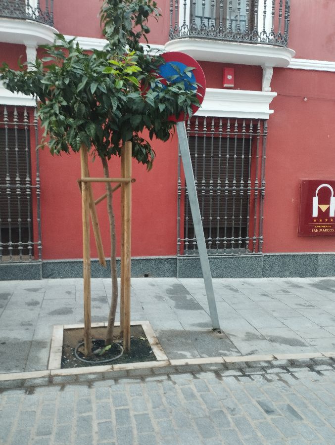 Señal de tráfico tumbada sobre un arbolito de esta calle