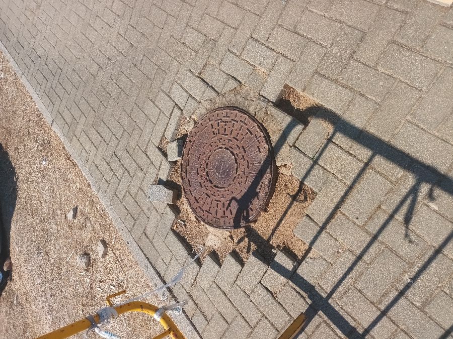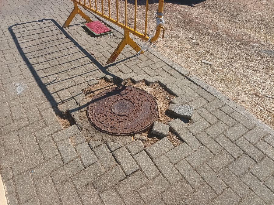 Acera rota junto a alcantarilla de saneamiento, riesgo de caídas