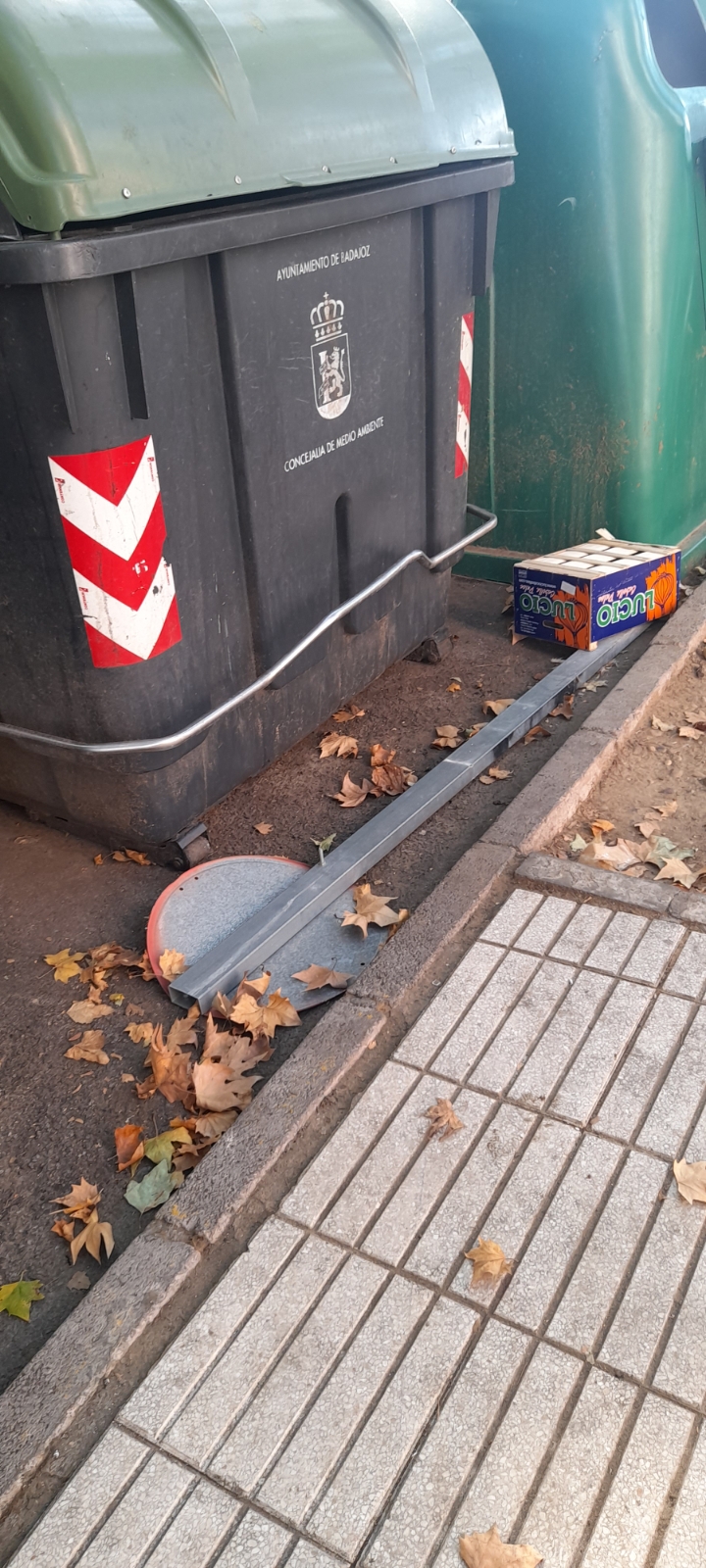 Señal derribada, tirada junto a los contenedores de la C/ Jacobo Rodríguez Pereira 42 (frente a UNIFMEM (aproximadamente, no funciona la geolocalización de la web)