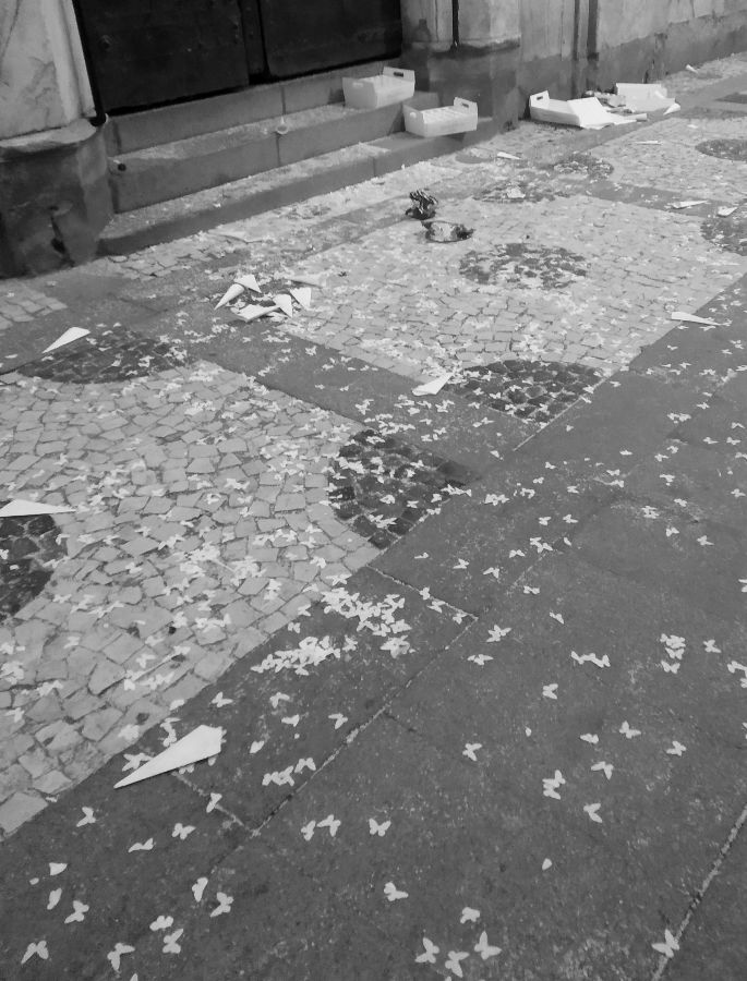 Tras las ceremonias los invitados dejan la calle en el estado que puede apreciarse. Junto a la entrada de la Concepción, hubo basura todo el domingo, desde las14.00 h hasta las 20.30 h. Después alguien limpio, supongo que el personal de limpieza. No se debería tolerar semejante marranada. Entre los perros y los drogadictos que se mean por la calle, los gitanos que tiran todo al suelo y dejan las basuras fuera de los contenedores, la alimentadora de gatos que deja los platos de comida por los suelos, la plaga de palomas y ahora también las bodas, la calle es un desastre.