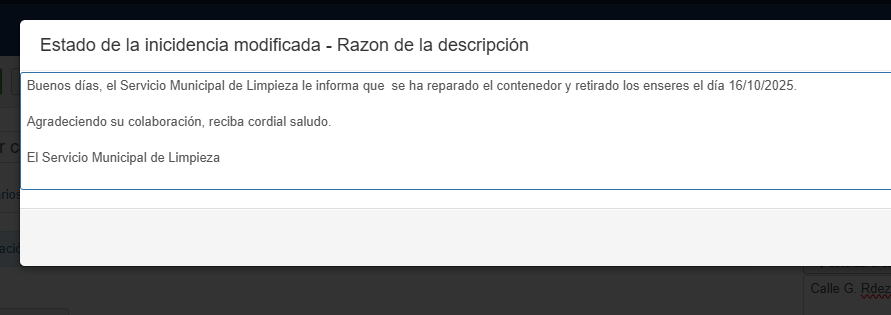 - Buenos días, el Servicio Municipal de Limpieza le informa que se ha limpiado la zona y reubicado los contenedores el día 16/10/2025. Agradeciendo su colaboración, reciba cordial saludo. El Servicio Municipal de Limpieza