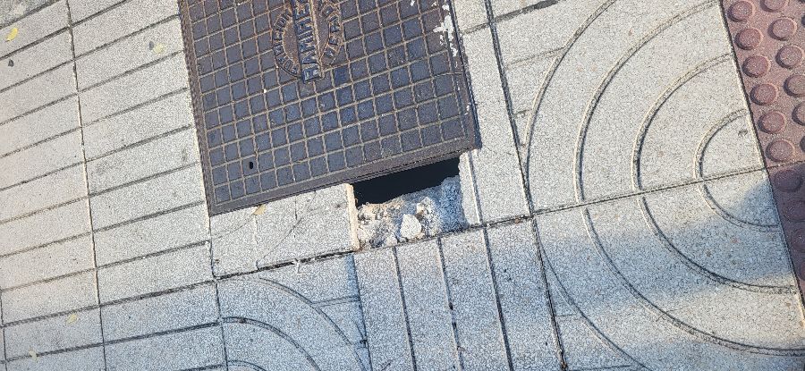 Agujero presentado en arqueta, sin protección y con riesgo de accidente en zona de tránsito.