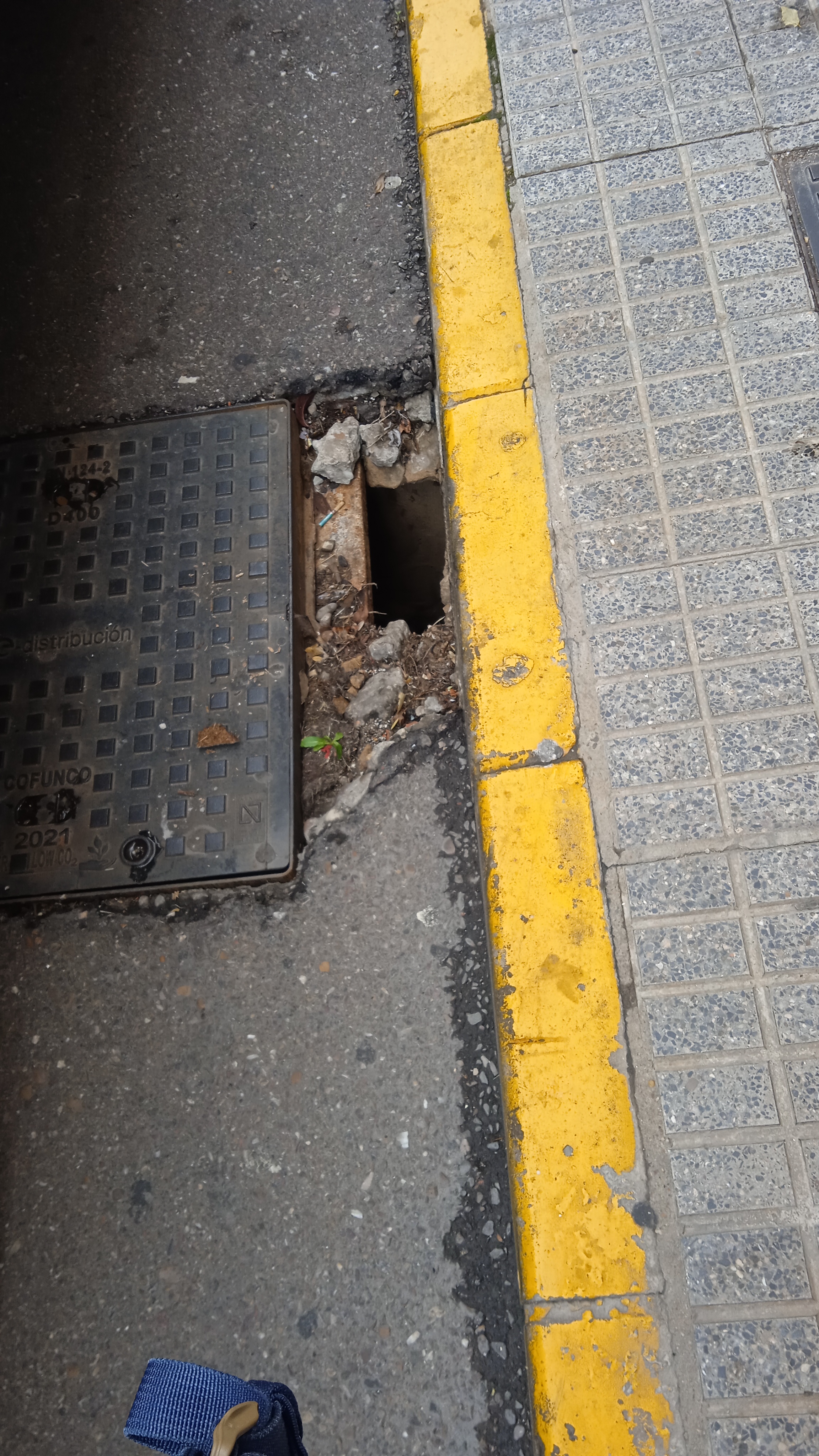 Hay un agujero en la calzada junto a la acera. Es peligroso para peatones y para vehículos.