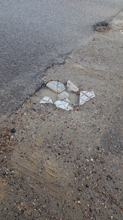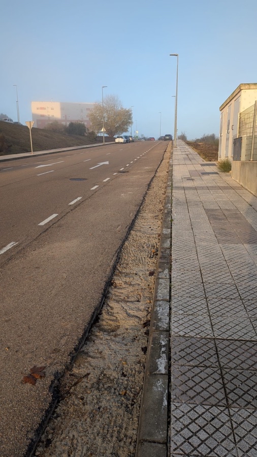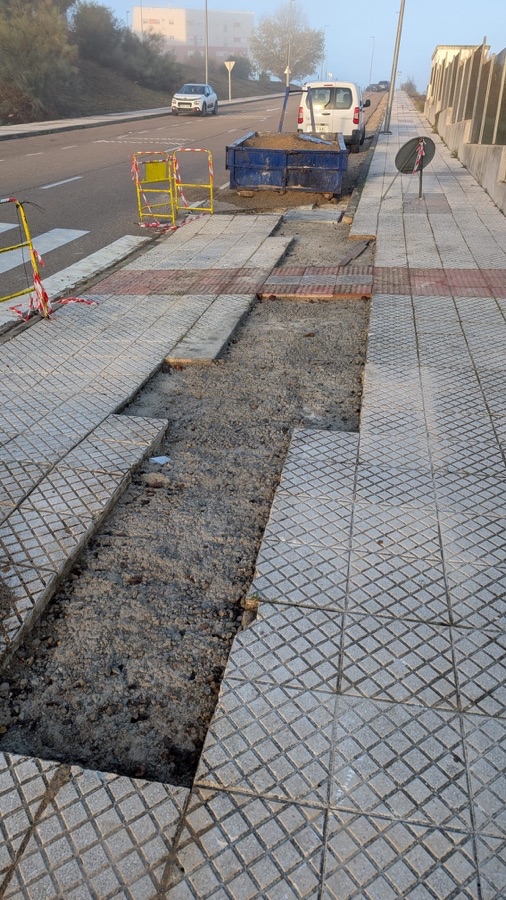 Hay dos socavones en la calzada, aún sin asfaltar, realizados para pasar cableado que llevan abiertos meses los cuales se han rellenado con tierra y trozos de baldosas rotas lo cual ha provocado múltiples pinchazos en ruedas de vehículos. Con las lluvias se va toda la tierra y se abren agujeros enormes. Igualmente la calzada pegado al acerado también fue abierta y hay que ponerle el asfalto. El acerado en la entrada del centro de salud sin baldosas desde la misma obra.