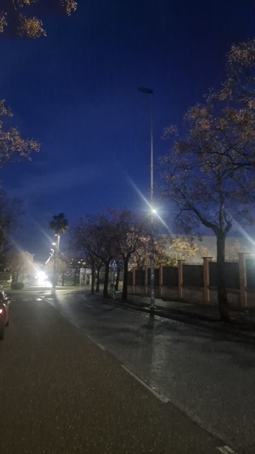 Farola sin luz, en la rotonda del colegio público de las Vaguadas encima de un paso de peatones y además cimbrea con el viento.