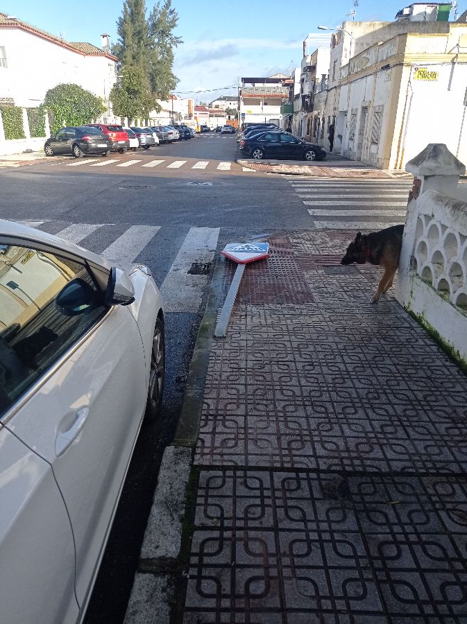 Buenos días señal de tráfico en el suelo justo en el paso de peatones que impide pasar sillas de minusválidos y carritos de bebés. Junto al colegio.