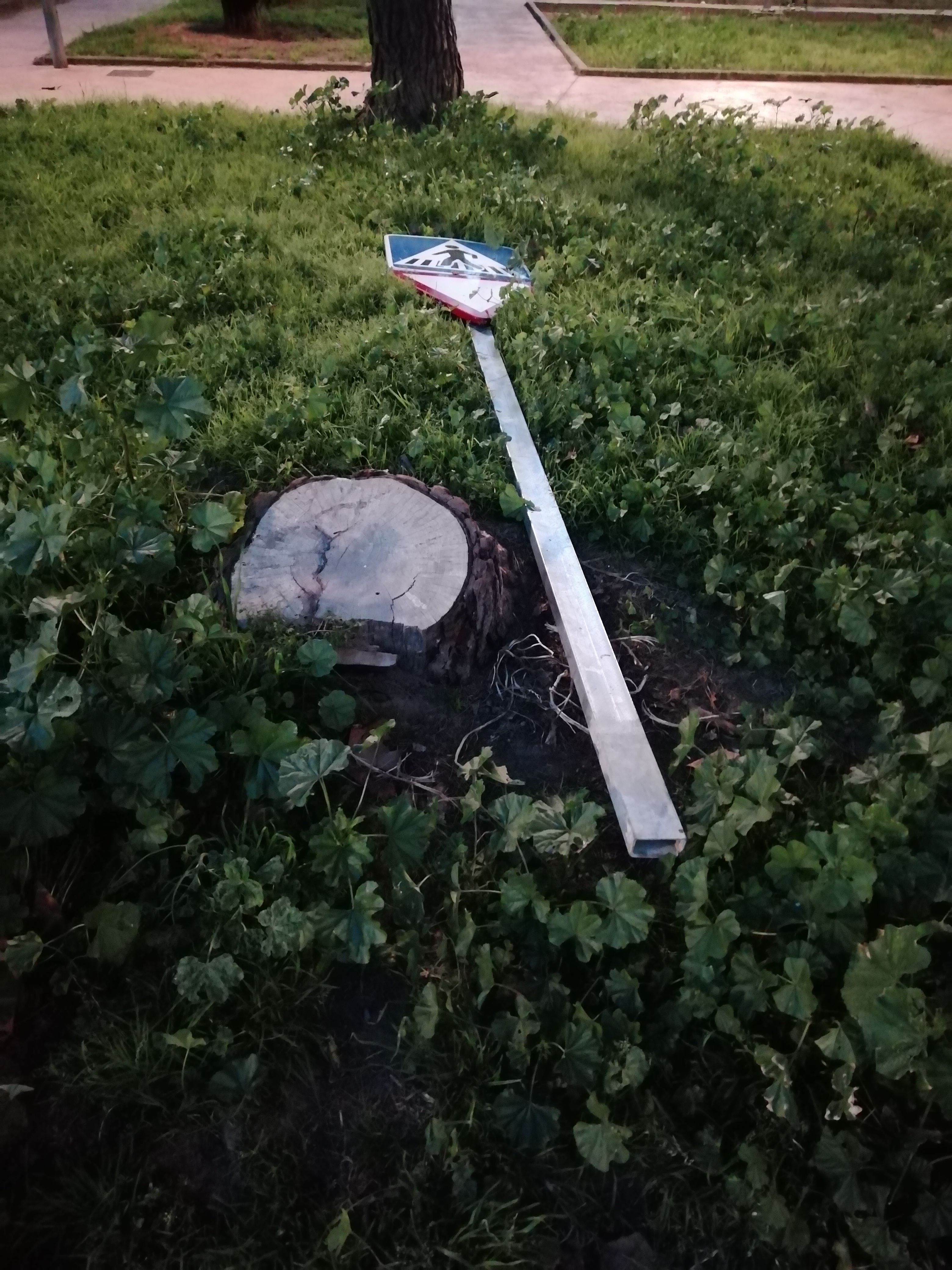 Hay una señal de tráfico desde hace varios días tumbada en medio del parque de Ciudad Jardín, entre la hierba, cerca de la parada del autobús en Calle La Campanilla
