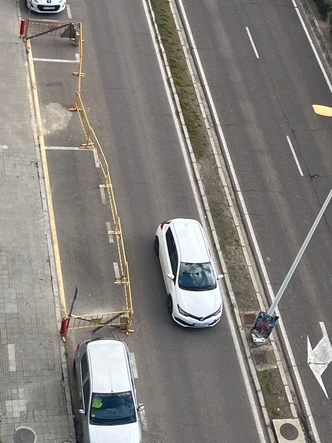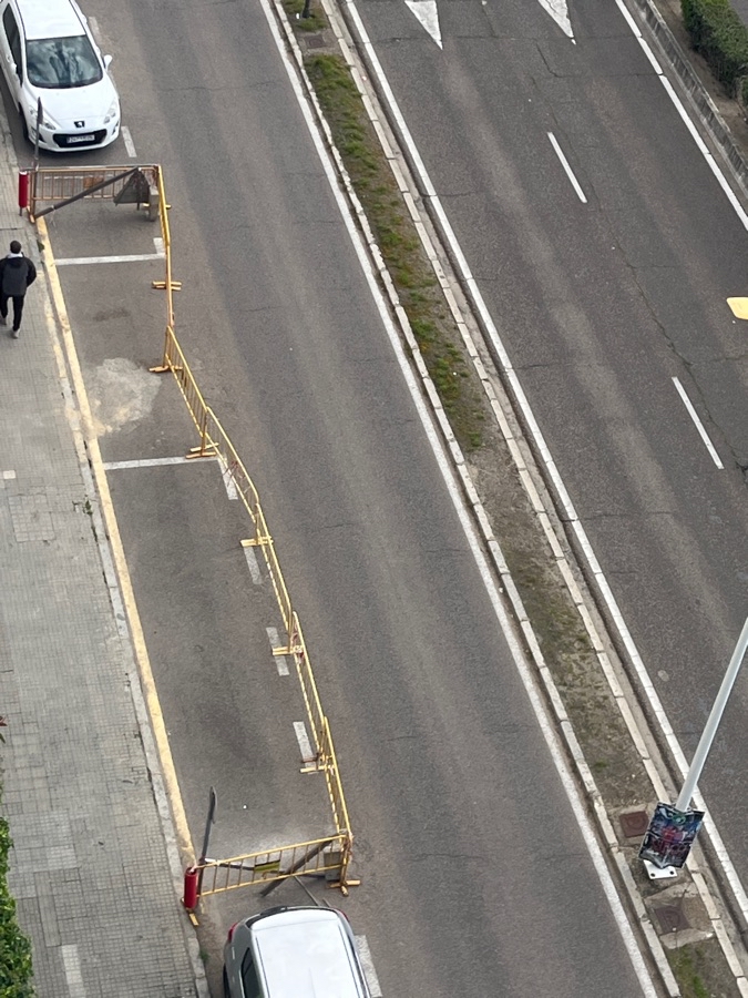 Espacio en la calzada invadido por empresa constructora desde hace meses. Reducción de plazas de aparcamiento después de abandonar la obra.