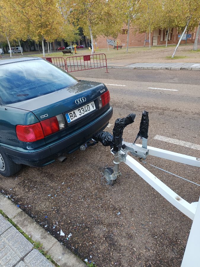 Vehículo marca Audi 80 20E color verde oscuro, matrícula BA3340V, estacionado desde noviembre de 2025. No tiene la pegatina de la ITV visible y lleva enganchado un remolque blanco con matrícula BA8043O. Antes estaba solo el remolque (desde hace varios años), pero ahora tiene el coche enganchado. No lo mueven, tiene plásticos en el enganche del remolque para que no se estropee a la intemperie, y cadenas en una de las llantas. Solicito la retirada de ambos elementos de la vía pública, muchas gracias.
