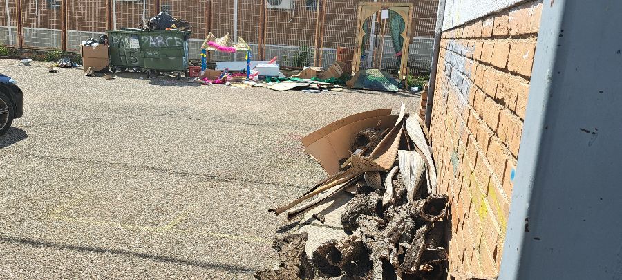 Llevamos más de un mes con la zona de contenedores llena de enseres y restos de adornos, artefactos, maderas, etc. Nadie los retira aunque pasen todos los dias los camiones de la basura, hay contenedores verdes llenos de restos de madera y no los retiran porque no es basura.
