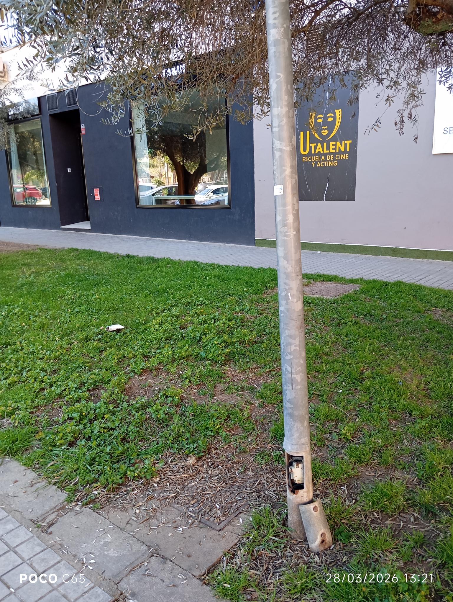 Farola sin tapa seguridad frente academia ingles Kids&Us Badajoz-Valdepasillas (aglomeración de niños entrada academia, posible peligro)