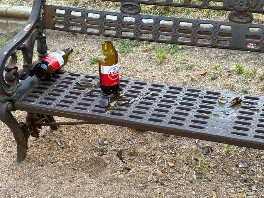 Botellas de cerveza rotas en un banco público, restos de cena del mcdonald, tenedores, envases… del Centro Hermano. Si acogen basura podían limpiarla.