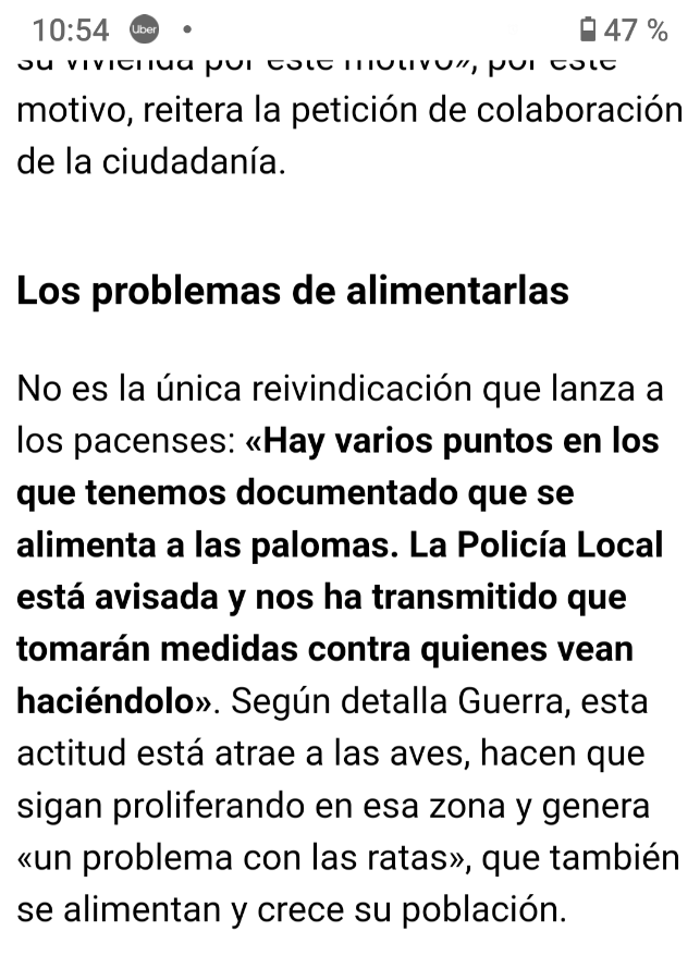 Una señora demente que vive en Concepción Arenal alimenta desde hace años a las palomas, gatos y por ende a ratas y cucarachas, generando un problema de salud pública. Cuando las autoridades toleran estas actividades "ilegales" contribuyen con su inacción a multiplicar el problema y los gastos derivados de tratar de paliarlo, recaen finalmente en el contribuyente. Adjunto captura del diario Hoy donde el técnico encargado de controlar la plaga de palomas se refiere a esos ciudadanos...