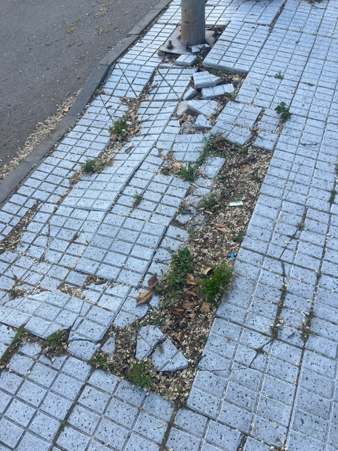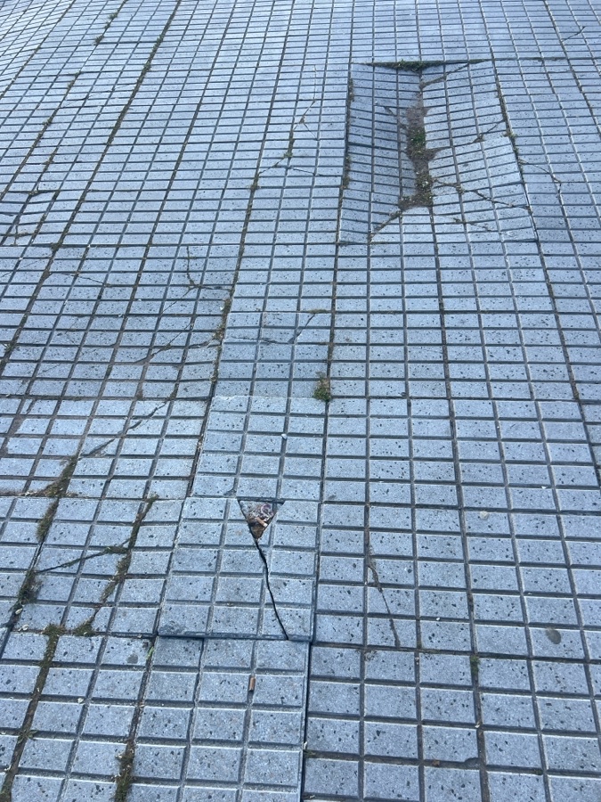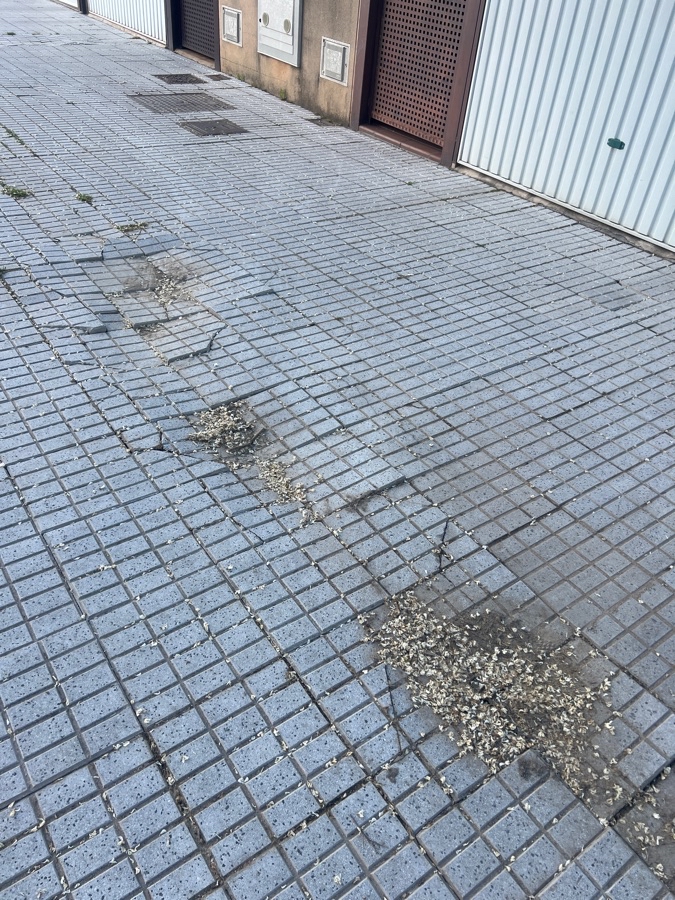 Las baldosas están levantadas por los coches que entran en sus cocheras y almacenan agua debajo con lo cual al pisarlas salta el agua sucia hacia arriba manchando a los viandantes