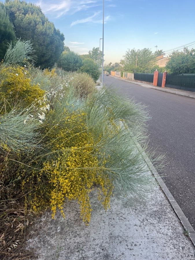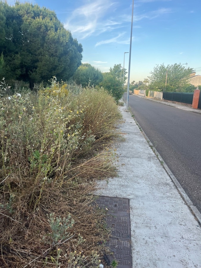 Vegetación que invade la acera y tienes que bajar a la carretera para pasar andando Calle pantano puerto peña
