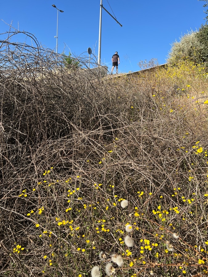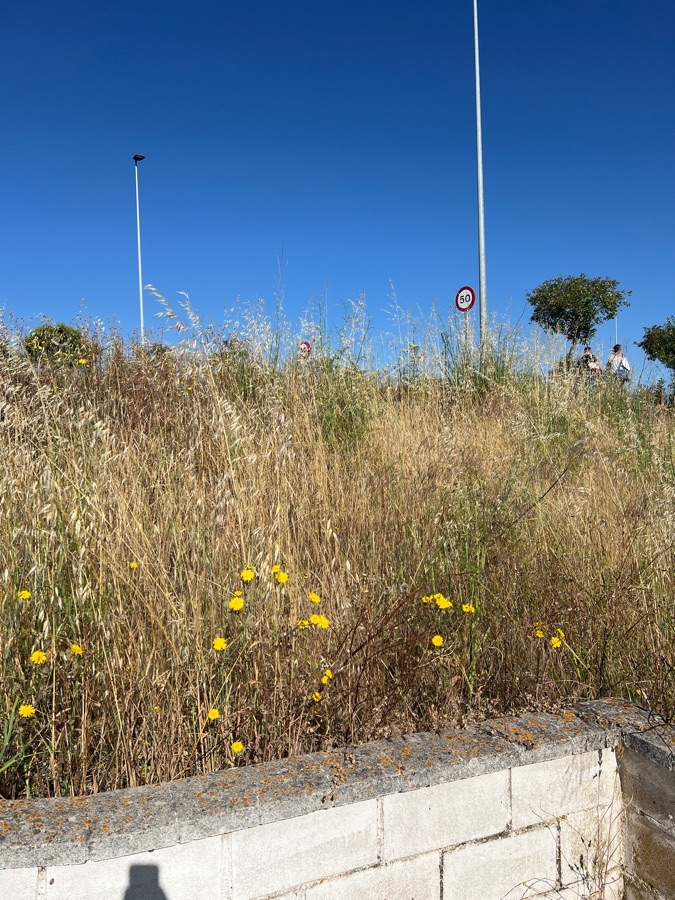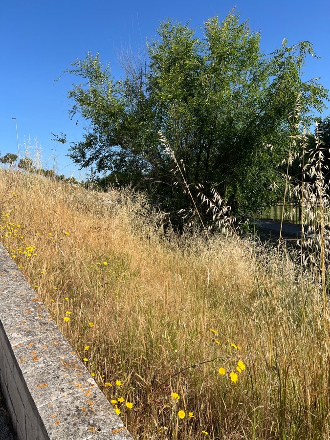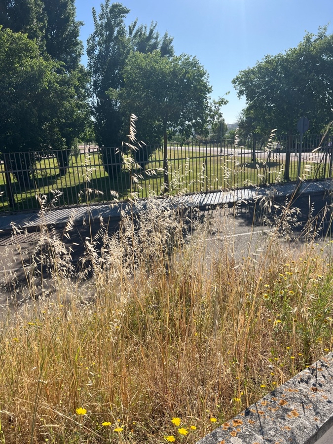 Pasto seco con riesgo de provocar incendios cerca del Puente Real. Cercano al barrio que está allí. Peligroso con las temperaturas de Badajoz